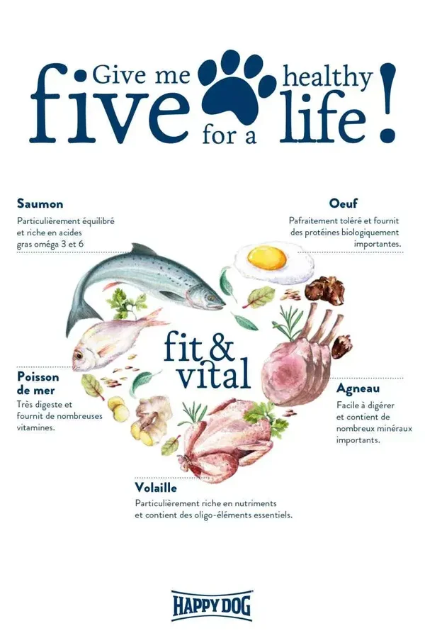 Voulez-vous que l'alimentation de votre ami à quatre pattes soit équilibrée, naturelle et saine ? Alors Happy Dog fit & vital est parfait pour votre boule de poils. Voici les cinq composants protéiques différents : Saumon, poisson de mer, œufs, agneau et volaille, pour une variété saine de protéines, en s'inspirant de la nature. Le saumon apporte des acides gras essentiels oméga-3 et oméga-6 qui sont parfaits pour la peau et le pelage. Le poisson de mer, qui est très facile à digérer, apporte de nombreuses vitamines différentes, tandis que l'œuf apporte des protéines de valeur biologique élevée et l'agneau de nombreux minéraux essentiels. Enfin, cette recette exclusive est complétée d'une volaille particulièrement riche en nutriments, qui sert d'apport d'oligo-éléments essentiels.