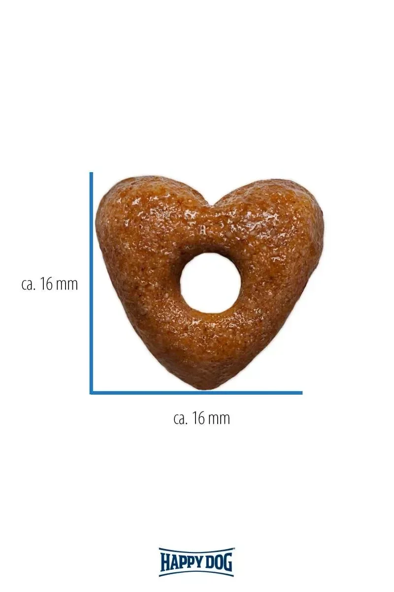 Une forme inédite ? Nos croquettes sont en forme de cœur avec un trou au milieu. Cela permet à votre chien de mieux mâcher et digérer l'aliment. La surface plus importante facilite également la décomposition des aliments dans l’estomac par les sucs gastriques de votre chien.