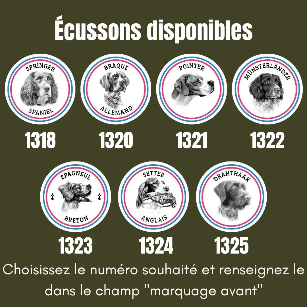 Elle est marquée d’un écusson sur le cœur, que vous pouvez personnaliser en indiquant le numéro du marquage souhaité + le texte à insérer (nom d’équipage par exemple).