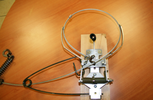 Le piège collarum est un piège à enlèvement d'appât. Lorsque le renard va venir se placer devant et tirer l'appat attaché au centre du piège, un lacet est propulsé autour du cou de l'animal et le maintient alors captif.
