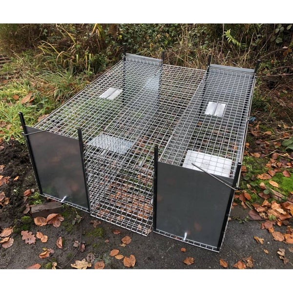 Poulailler à renards 2 cages à 2 entrées maille 30x30 fil de 3mm galvanisée + 1 module appât centrale sur la longueur des 2 cages