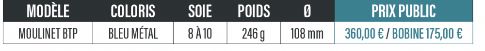 – Le moulinet BTP est doté d’un frein micrométrique progressif, extrêmement puissant, permettant de maîtriser des poissons trophées tout en conservant une précision parfaite.