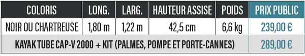 Livré avec un tapis de réception gradué, le kayak tube cap – V 2000 s’impose comme un produit inédit, technique et ambitieux, destiné aux pêcheurs souhaitant vivre une expérience de pêche surélevée, stable et terriblement efficace.
